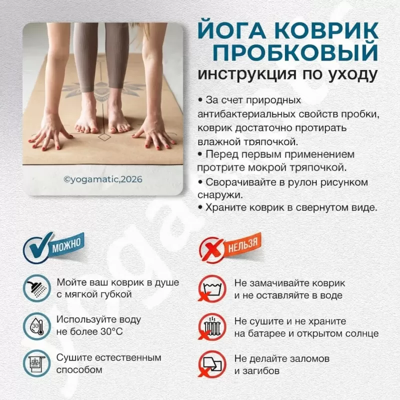 - Сохранять чистоту и свежесть — в уходе эти йогаматы практически не нуждаются благодаря антибактериальным свойствам пробки. После занятий достаточно просто протереть поверхность влажной тряпочкой, и только при сильных загрязнениях можно помыть в душе губкой с мыльной основой. Хранить рекомендуем в свёрнутом в рулон виде.